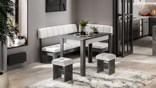 Размеры (мм):Размеры скамьи ШхГхВ: 1534×1134×840Размеры стола ШхГхВ: 1000×600×740Размеры табуретов ШхГхВ: 330×330×450
