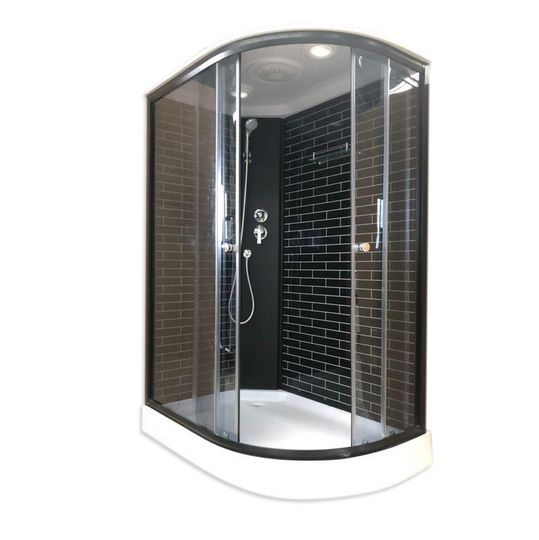 - Комплектация: поддон 15 см с бортиком, черный профиль, черные дуги, черная панель, тропический душ, ручной душ с держателем, стеклянная полка, смеситель, сифон;