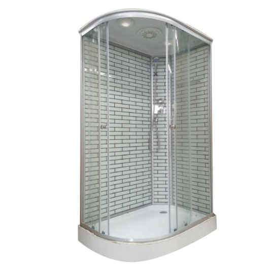 - Комплектация: поддон 15 см с бортиком, серебряный матовый профиль и дуги, верхний душ, ручной душ с держателем, стеклянная полка, стеклянная панель, смеситель.