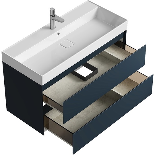 Тумба Aqwella Geometria 100 оснащена двумя выдвижными ящиками на направляющих скрытого монтажа, что обеспечивает плавное скольжение и мягкое закрывание. Фасады и боковины с обработкой торцов под углом 45 градусов создают лаконичность и изящный, почти монолитный силуэт в закрытом состоянии. Все грани имеют округлую фрезеровку, обеспечивая приятные тактильные ощущения при открывании. Внутри ящиков - отделка под светлый камень, боковины выполнены из толстого тонированного стекла, что добавляет коллекции элегантности.