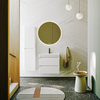 Тумба Aqwella Geometria 65 оснащена двумя выдвижными ящиками на направляющих скрытого монтажа, что обеспечивает плавное скольжение и мягкое закрывание. Фасады и боковины с обработкой торцов под углом 45 градусов создают лаконичность и изящный, почти монолитный силуэт в закрытом состоянии. Все грани имеют округлую фрезеровку, обеспечивая приятные тактильные ощущения при открывании. Внутри ящиков - отделка под светлый камень, боковины выполнены из толстого тонированного стекла, что добавляет коллекции элегантности.