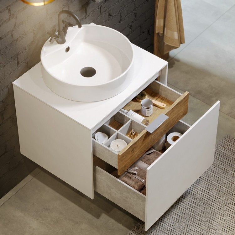 Тумба Mobi 60 оснащена двумя ящиками: основным и внутренним, скрытым за фасадом. Направляющие ящиков обеспечивают плавное и мягкое закрывание. Внутренний ящик тумб укомплектован пластиковым разделителем для хранения различных мелочей. Внутренняя отделка ящиков комбинированная: боковины – цвет бетон светлый, дно – дуб балтийский. В комплект тумбы Mobi входит специальный сифон, позволяющий экономить пространство мебели. Фасады, боковины и столешницы из МДФ толщиной всего 10 мм. Подходит любой наставной умывальник.