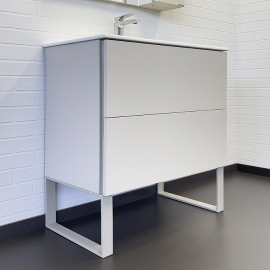 Напольная тумба с двумя ящиками, оборудованными направляющими с системой плавного закрывания. Открытие ящиков производится при помощи вертикальных профильных ручек, интегрированных в боковые стенки тумбы. Ножки тумбы из металла защищены от воздействия влаги порошковой покраской. Тумбу можно использовать как подвесную, если не использовать ножки.