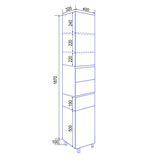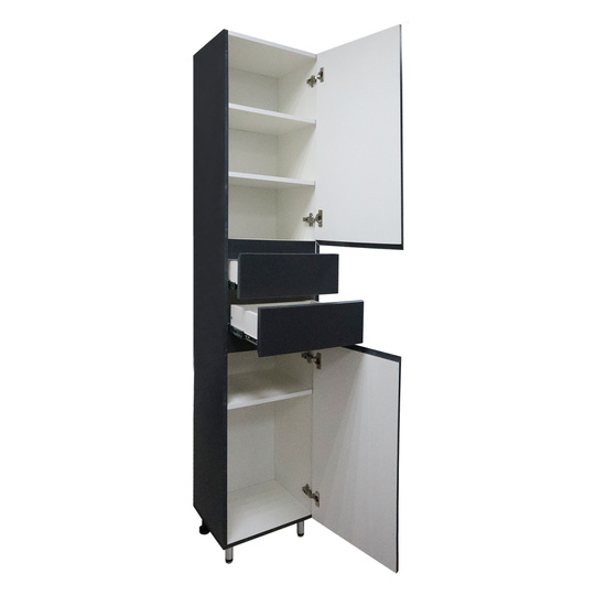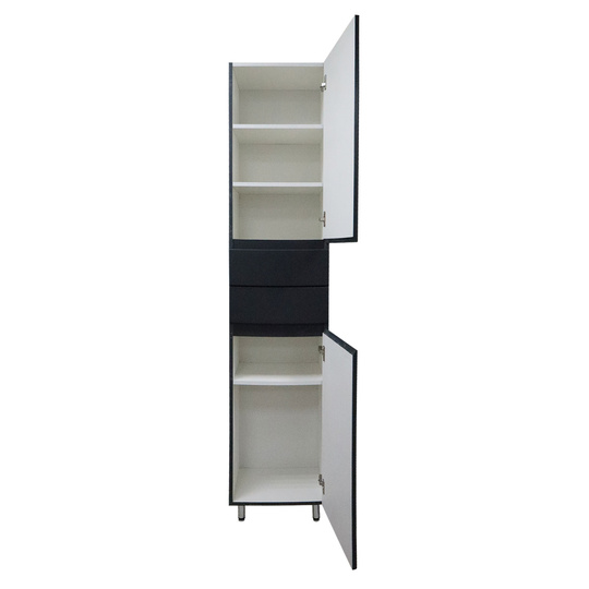 Пенал Azario Эстима 40 оснащен сверху и снизу двумя распашными дверцами на доводчиках, а посередине двумя выдвижными ящиками без доводчиков. В верхнем распашном фасаде две полочки внутри, в нижнем - одна полочка. Пенал установлен на хромированные ножки. Корпус изготовлен из ЛДСП, фасады МДФ толщиной 16 мм. Корпус и фасады производства Kronospan. Бока и фасады крашеные итальянской эмалью.
