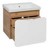 Тумба Skandi 60 оснащена двумя ящиками: внешним и внутренним. Внешний ящик на направляющих скрытого монтажа с доводчиком. Внутренний открывается с помощью механизма Push-to-Open. Корпус тумбы выполнен из ЛДСП в древесной текстуре "дуб крафт золотой", а фасад внешнего ящика - из МДФ в белой глянцевой эмали. Лаконичным завершением общей композиции является стильная хромированная ручка.