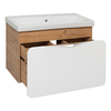 Тумба Skandi 80 оснащена двумя ящиками: внешним и внутренним. Внешний ящик на направляющих скрытого монтажа с доводчиком. Внутренний открывается с помощью механизма Push-to-Open. Корпус тумбы выполнен из ЛДСП в древесной текстуре "дуб крафт золотой", а фасад внешнего ящика - из МДФ в белой глянцевой эмали. Лаконичным завершением общей композиции является стильная хромированная ручка.