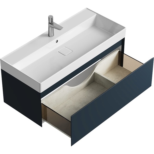 Тумба Aqwella Geometria 100 оснащена одним выдвижным ящиком на направляющих скрытого монтажа, что обеспечивает плавное скольжение и мягкое закрывание. Фасады и боковины с обработкой торцов под углом 45 градусов создают лаконичность и изящный, почти монолитный силуэт в закрытом состоянии. Все грани имеют округлую фрезеровку, обеспечивая приятные тактильные ощущения при открывании. Внутри ящиков - отделка под светлый камень, боковины выполнены из толстого тонированного стекла, что добавляет коллекции элегантности.