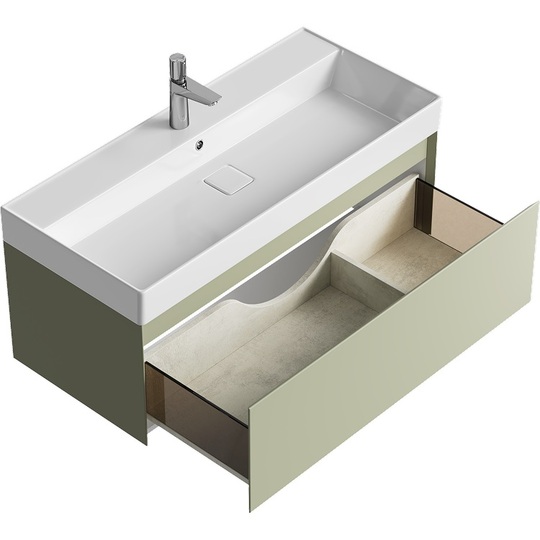 Тумба Aqwella Geometria 100 оснащена одним выдвижным ящиком на направляющих скрытого монтажа, что обеспечивает плавное скольжение и мягкое закрывание. Фасады и боковины с обработкой торцов под углом 45 градусов создают лаконичность и изящный, почти монолитный силуэт в закрытом состоянии. Все грани имеют округлую фрезеровку, обеспечивая приятные тактильные ощущения при открывании. Внутри ящиков - отделка под светлый камень, боковины выполнены из толстого тонированного стекла, что добавляет коллекции элегантности.